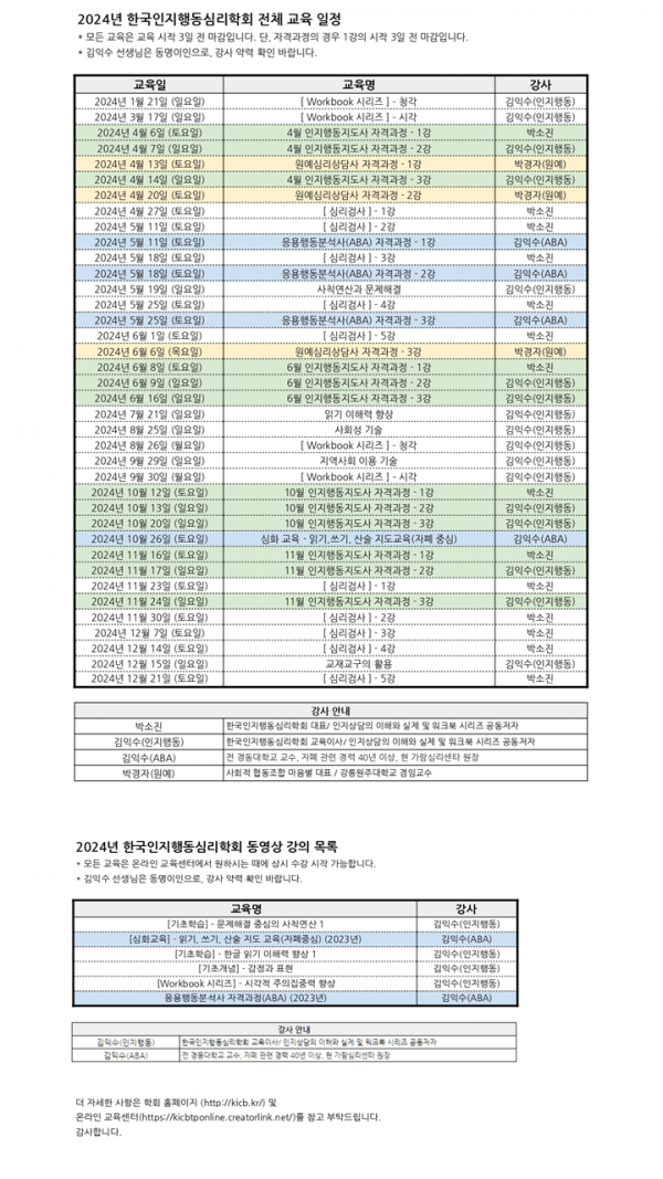 ★2024년 한국인지행동심리학회 교육 안내(전체교육 목록)